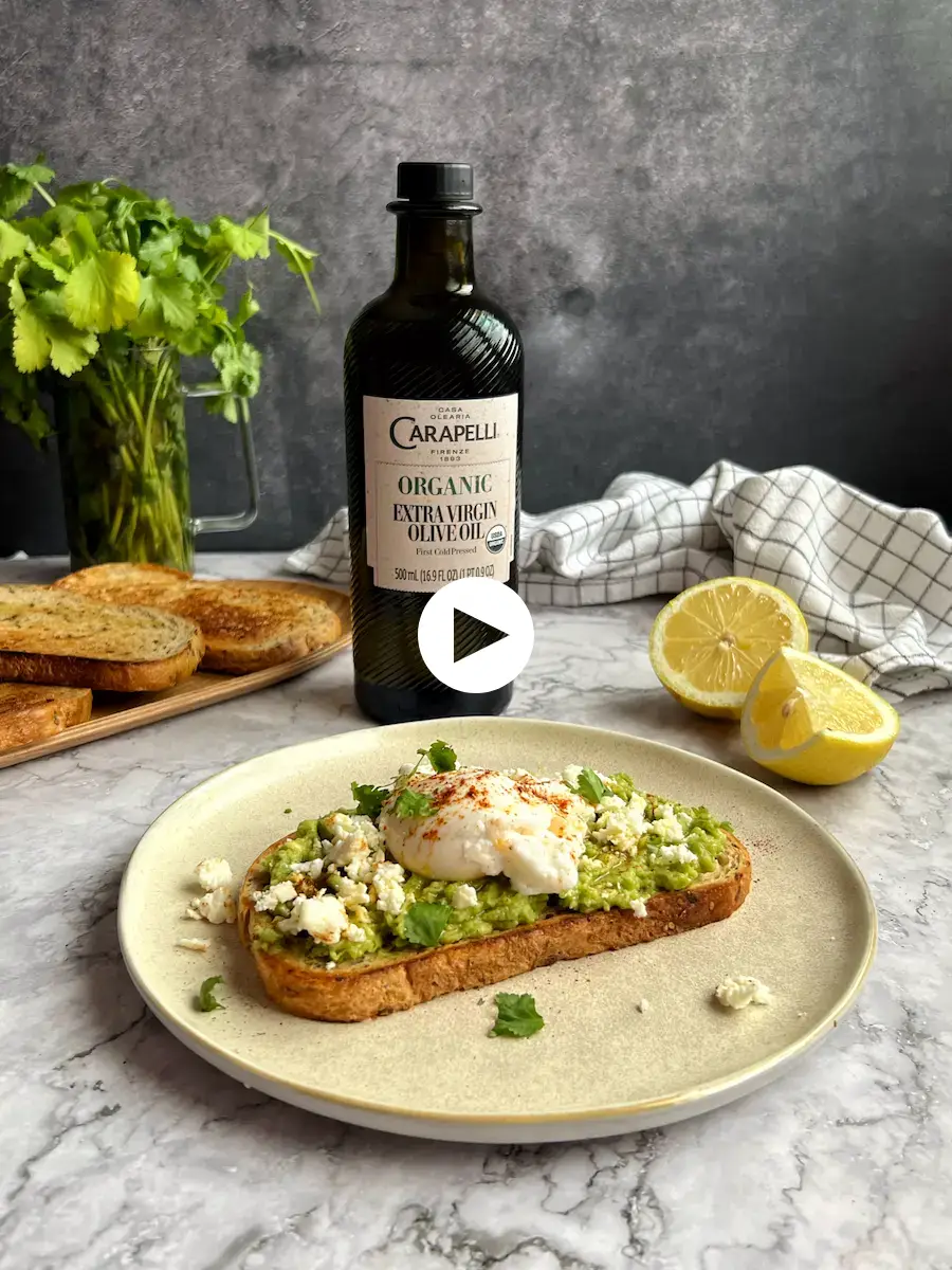 4 Spread avocado on toast, top with poached egg, feta, cilantro, paprika, and a drizzle of olive oil.