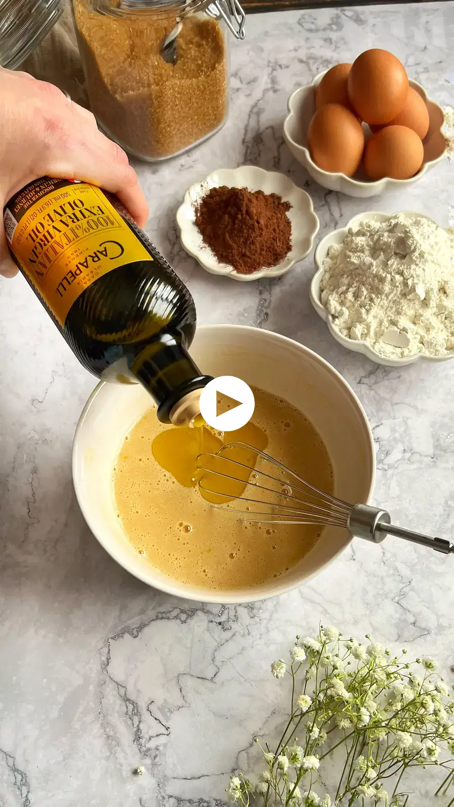2 Beat the eggs with yogurt, olive oil, and brown sugar until light and airy.