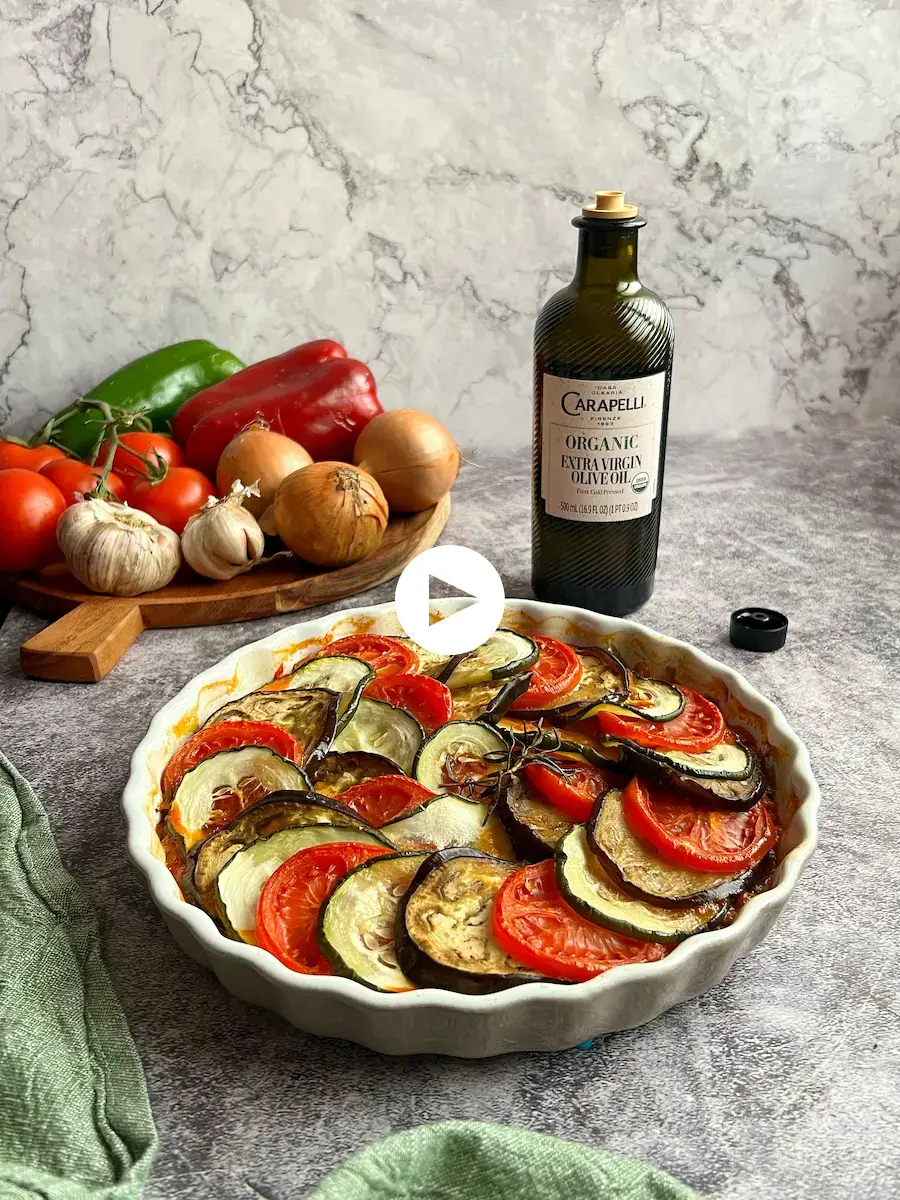 5 Spread sauce in a 12-inch quiche dish. Arrange sliced vegetables on top.