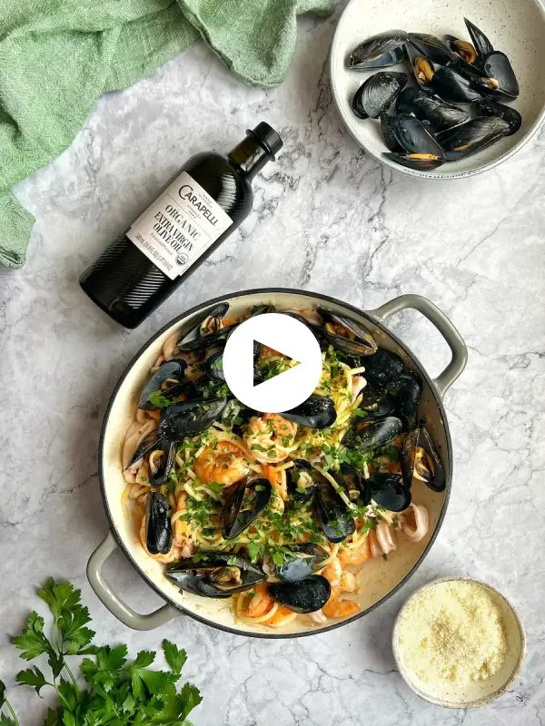 6 Stir in Parmesan and mussels. Garnish with parsley and drizzle with olive oil.