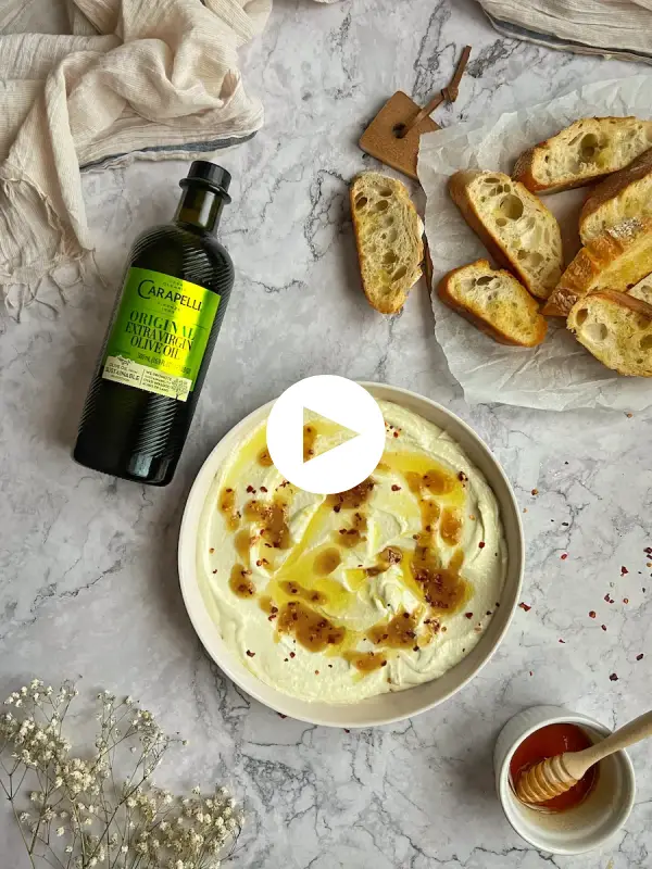 4 Serve dip topped with garlic-honey mixture and toasted bread.